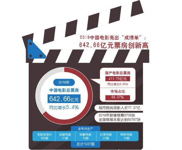 该报告显示,2019年中国电影总票房642.66亿元,同比增长5.4%,其中国产电影持续发力,票房达411.75亿元。报告统计显示,90后已成为观影主力人群,贡献了全年55%的票房收入;出生于2000年以后的观影受众规模也在快速增长,贡献了全年票房的7%。